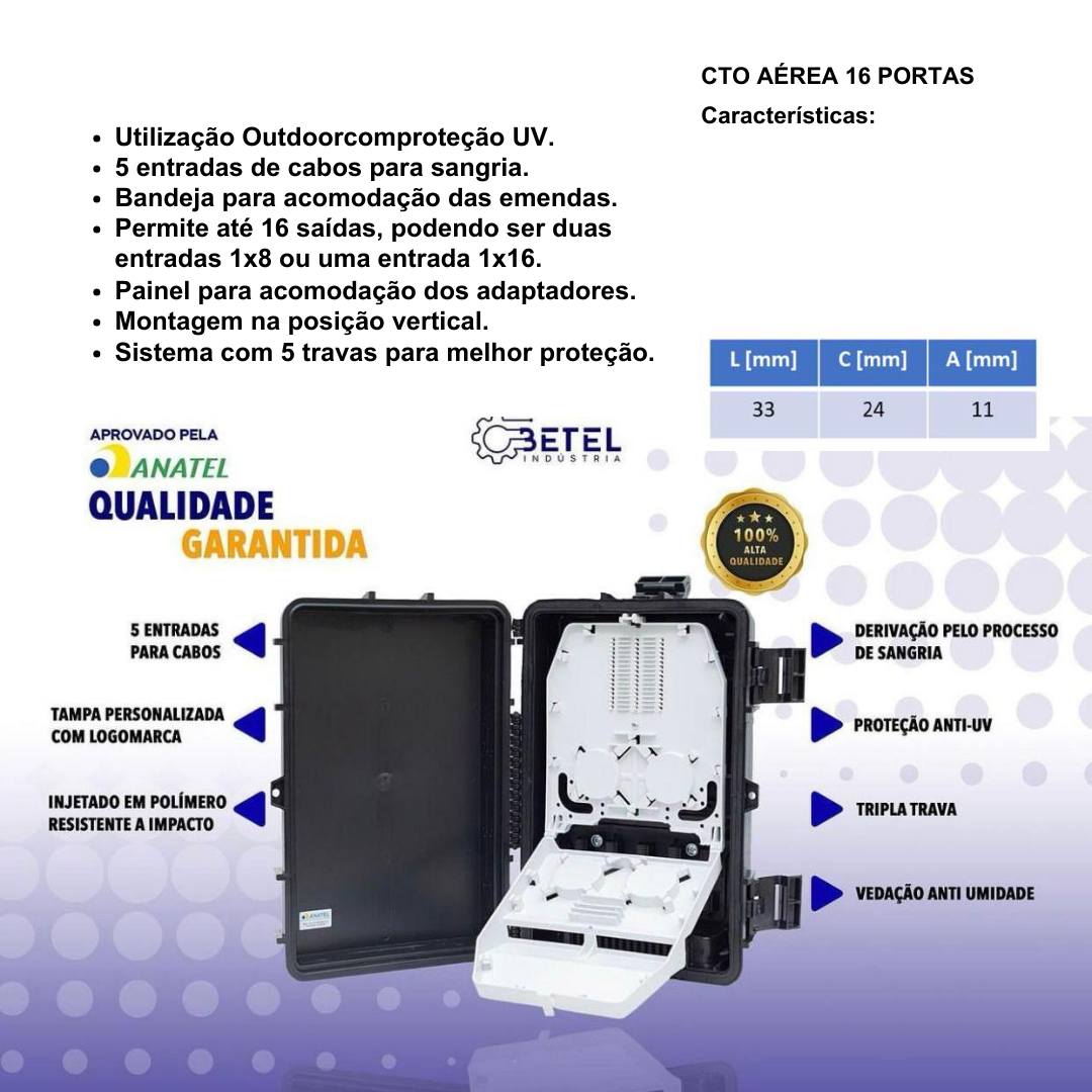 A CTO Aérea 16 Portas é a solução ideal para provedores que buscam segurança, durabilidade e flexibilidade em suas redes ópticas.