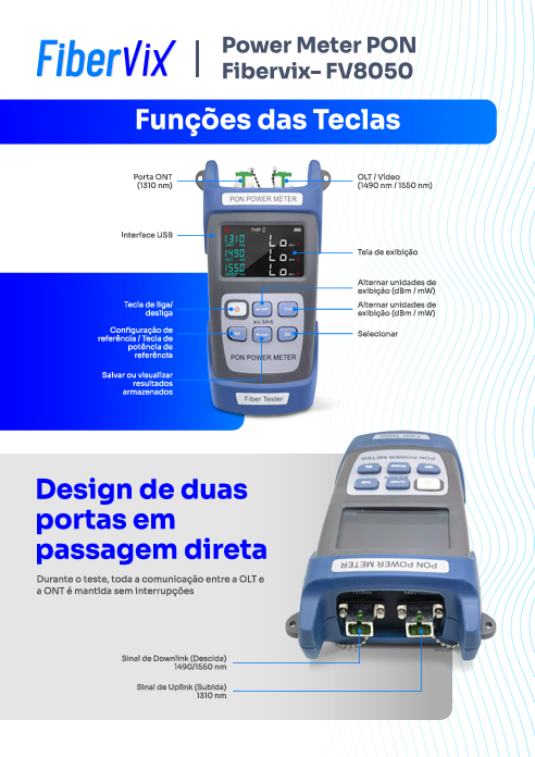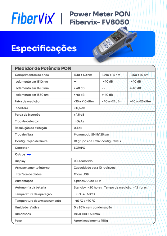 - Medidor de potência PON portátil, testador óptico, engenharia de rede, armazenamento de dados, 1310 nm, 1490 nm, 1550 nm, vídeo, dispositivo de medição de sinais FTTX ONT OLT, este medidor de potência óptica PON foi projetado para a instalação, operação e manutenção de redes ópticas. Design de tela LCD colorida, suporte, medida e exibição de sinais de voz, dados e vídeo na arquitetura PON ao mesmo tempo, enquanto testa o sinal de uplink de 1310 nm, 1490 nm e sinal de downlink de 1550 nm no sistema PON. Suporta dez armazenamentos de dados, na interface de teste, pressione e segure V/LOAD para salvar o valor da potência t, pressione rapidamente V/LOAD para entrar no modo de visualização do valor salvo. Especificações: Nome: Medidor de potência PON: plásticos Interface óptica: contatos físicos angulares, UPC (opcional) Comprimento do teste: 1310 mais ou menos 50 nm/1490 mais ou menos 15nm/1550 plus ou menos 10 nm Isolamento 1310 nm: --/40dB/40dB Isolamento 1490nm: 40dB/--/40dB Isolamento 1550nm: 40dB/40dB/-- Faixas de medição: -35 a &,43; 10dBm/-40 a &,43; 12dBm/-40 a &,43; 25dBm Medição incerteza: LEQ0,5dB Perda de inserção: LEQ1,5dB Tipo de detector: InGaAs Resolução da tela: 0,1dB Tipo: SM 9/125micro-m Configuração do valor de leitura: 10 grupos Conector óptico: SCIAPC Display: tela LCD colorida Armazenamento de dados: 10 Interface de dados: Micro USB Fontes de alimentação: 3 pilhas AA de 1,5 V (incluídas) Vida útil da bateria: 20 horas em espera; Medição 12 horas Temperatura de abertura: -10 horas Graus Celsius a &,43; 50 graus Celsius Temperatura de armazenamento: -40 graus Celsius a &,43; 70 graus Celsius Umidade relativa: 0-90 por cento sem condensação Tamanho do item: 180 * 100 * 50 mm/7,09 * 3,94 * 1,97 pol Peso do item: 150 g/5,29 onças Tamanho do pacote: 210 * 122 * 70 mm/8,27 * 4,80 * 2,76 polegadas Peso do pacote: 581 g/20,49 onças Lista de embalagem: 1 * Medidor de potência PON 1 * Bolsa de armazenamento 1 * Guiné